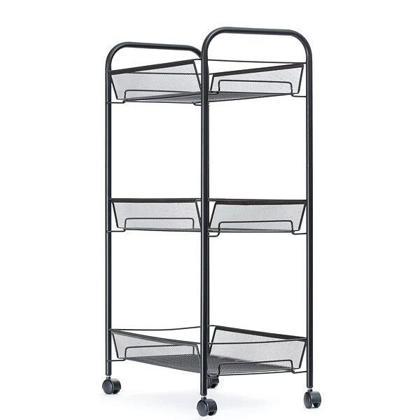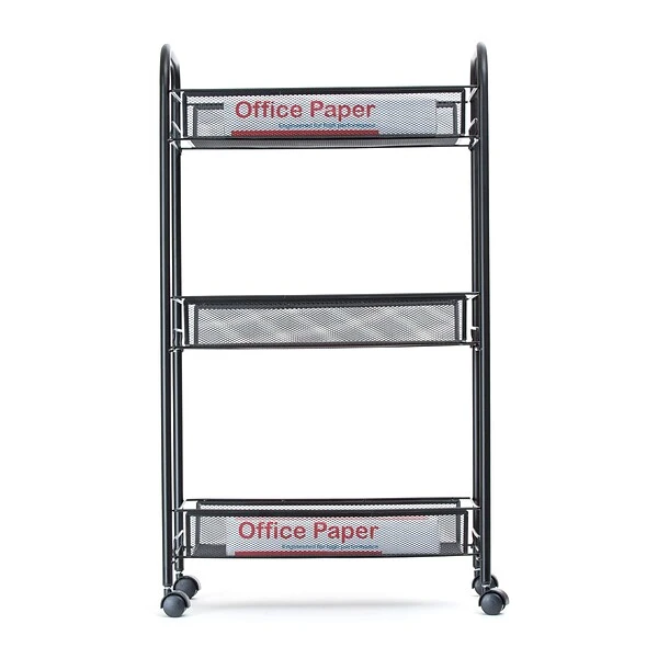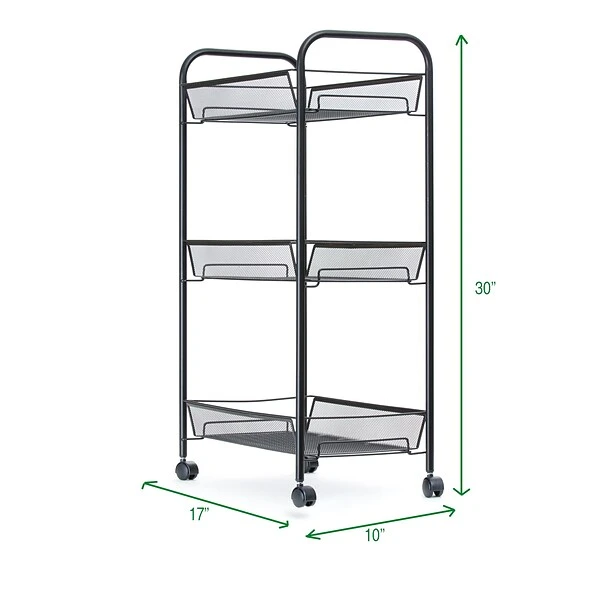 There are so many ways one can use the Mind Reader 3 shelf metal mesh rolling utility cart. From the office, home office, kitchen, or even the bathroom, this utility cart converts any space to extra storage space. Casters on the bottom of the cart provide easy mobility throughout. Four shelves provide plenty of room and easy access for your stored items. Use the Utility Cart in your office to provide a spot for books, binders, printer paper and supplies. In the kitchen, it’s great for storing cereals and containers. Use it to store books, magazines and photo albums in your family room. This Cart is made of sturdy metal with a Black powder-coated finish that looks great in any space.