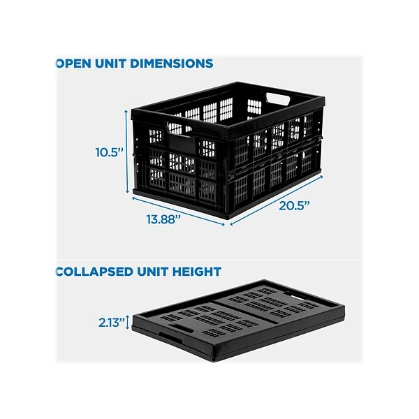 This collapsible and stackable storage crate can carry up to 51.78 qt., making it easier to stay organized. It can fold down to 2.13″ for easy portability and storage when not in use. This Mount-It! storage crate is designed with the ability to stack multiple crates on top of one another. The grated wall design, constructed with heavy-duty plastic, allows you to easily see the contents inside. It features heavy-duty side handles for an easier way to carry the load.