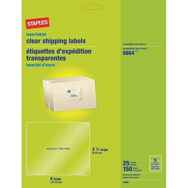 Give your mail a professional look with these Staples shipping labels. Each of them is coated with a permanent adhesive to ensure they stay wherever you stick them. These Staples shipping labels are clear and print smudge-free and jam-free from any inkjet or laser printer to give packages vibrant color and crystal-clear text that easily handles shipping.