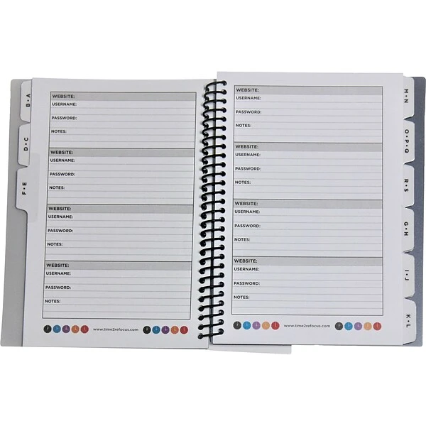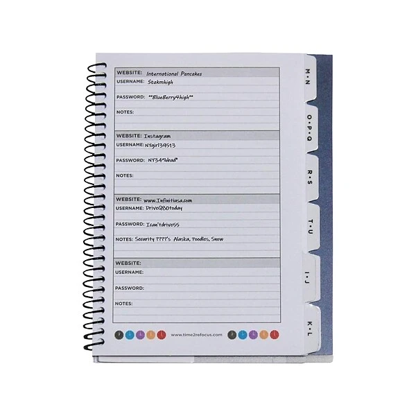 - Alphabetical tabs organize your account information such as websites, username, passwords, and more, including space for security questions