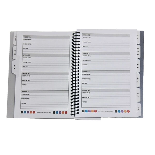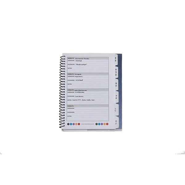 - Alphabetical tabs organize your account information such as websites, username, passwords, and more, including space for security questions
