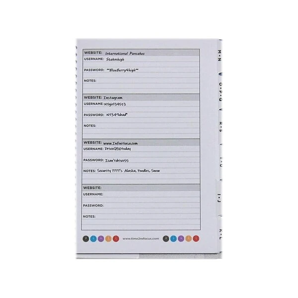 - Alphabetical tabs organize your account information, such as website, username, password and more, including space for security questions
