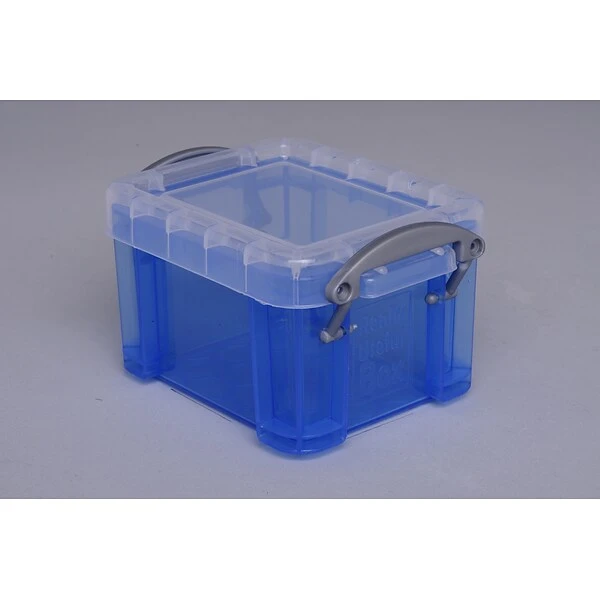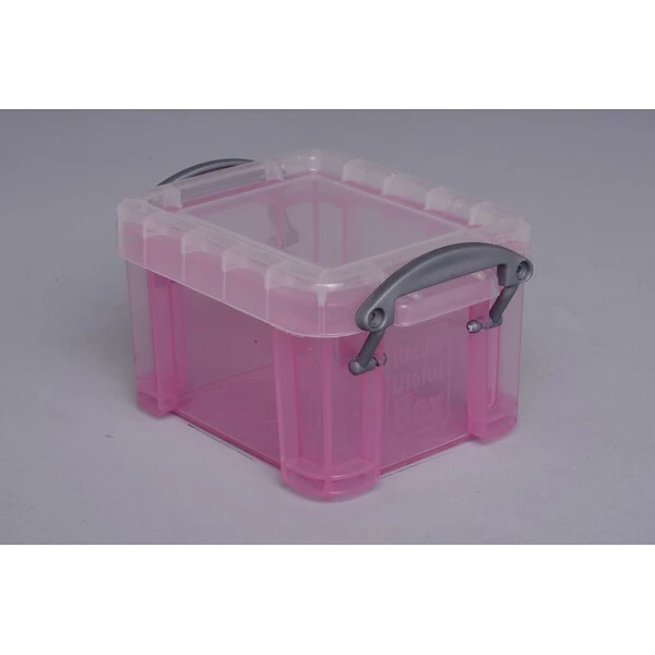 The Really Useful Box® with 0.14 liter capacity in transparent assorted colors can be recycled. Made with 100 percent polypropylene, these boxes are constructed for durability and have reinforced sides to increase compression strength so boxes maintain their shape. Totally flat bottom increases rigidity for stability and allows for perfect stacking with or without lid. The lockable lid is secured with two latchable handles to protect contents of the box from dust and water splashes. It measures 1-1/2″ x 1-3/4″ x 2-1/4″ and is ideal for paperclips, nails, small home and office items