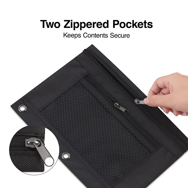 Stash pens, pencils and other small items inside this three-ring pencil pouch. Two zippered compartments make it easy to organize your supplies, while the durable construction stands up to frequent use. The reinforced holes work with standard three-ring binders for easy access during classes or business meetings. With a neutral black color, this Staples three-ring pencil pouch offers a professional appearance.