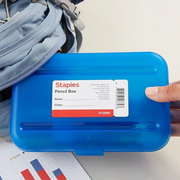 Organize your desk or study space with this Staples pencil box. A snap closure keeps pens, pencils and erasers safely tucked away inside, and the compact size fits in small desks, backpacks or box drawers. Durable plastic construction stands up to regular everyday use in the classroom or office. The blue color brings a fun look to this Staples pencil box, making it ideal for students and teachers alike.