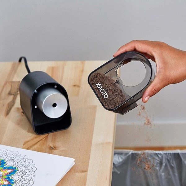 Spend less time sharpening and more time writing with the break-resistant X-ACTO XLR Pencil Sharpener. With the Pencil Saver feature, this electric pencil sharpener prevents over-sharpening to keep tips from breaking and frustration from setting in. A slip-resistant bottom keeps the pencil sharpener steady when in use. Finally, the SafeStart electric motor stops when the easy-to-empty shavings bin is removed. It’s also compatible with colored pencils. Stay sharp with X-ACTO, the #1 electric pencil sharpener brand!